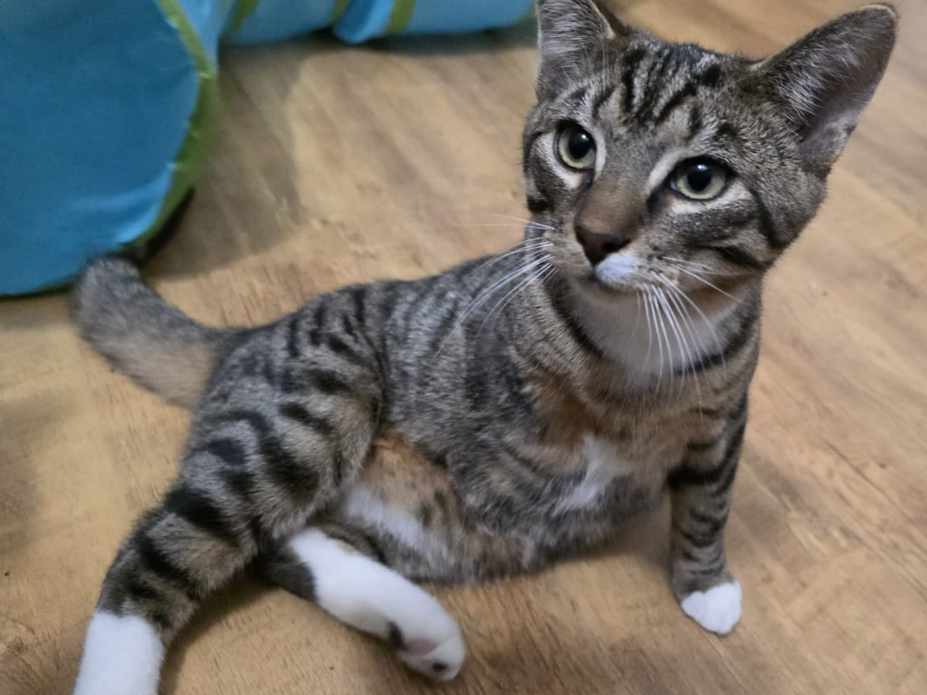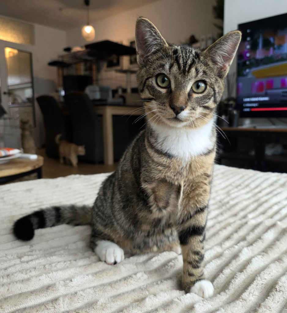 Bono heeft op jonge leeftijd al echte pech gehad en is door een ongeluk zijn voorpootje kwijtgeraakt. Gelukkig waren wij er snel bij en is hij direct geopereerd en ziet de amputatie er netjes uit. In de eerste dagen merkten we dat Bono erg down was en stil in een hoekje bleef zitten. Na een paar dagen kwamen er 2 jonge kittens bij, Kiros en Bobbie. Vrijwel direct fleurde Bono helemaal op en begon hij te “oefenen” op zijn 3 pootjes.