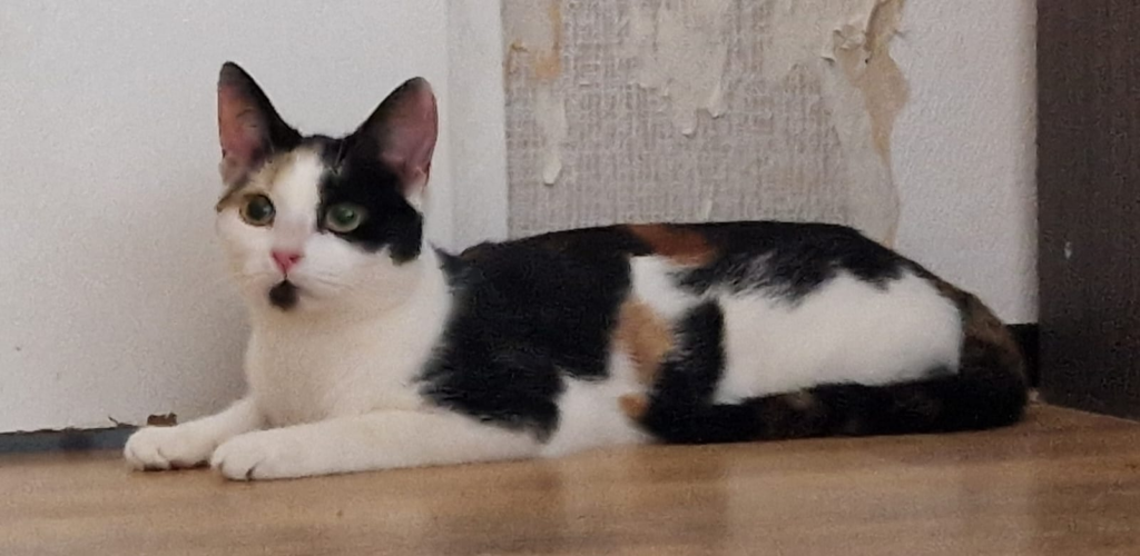 Ik ben geboren in een huis met veel snuitjes, teveel snuitjes waardoor ik op de achtergrond ben geraakt. Menselijk contact is mij daar niet geleerd, ondanks dat ziet mijn pleegmama dat ik juist het contact op zoek, overal waar zij gaat wil ik bij zijn en durf dan ook dicht naast haar te komen liggen, echter vind ik aanraking heel spannend en laat ik mij dan ook (nog) niet aanraken.