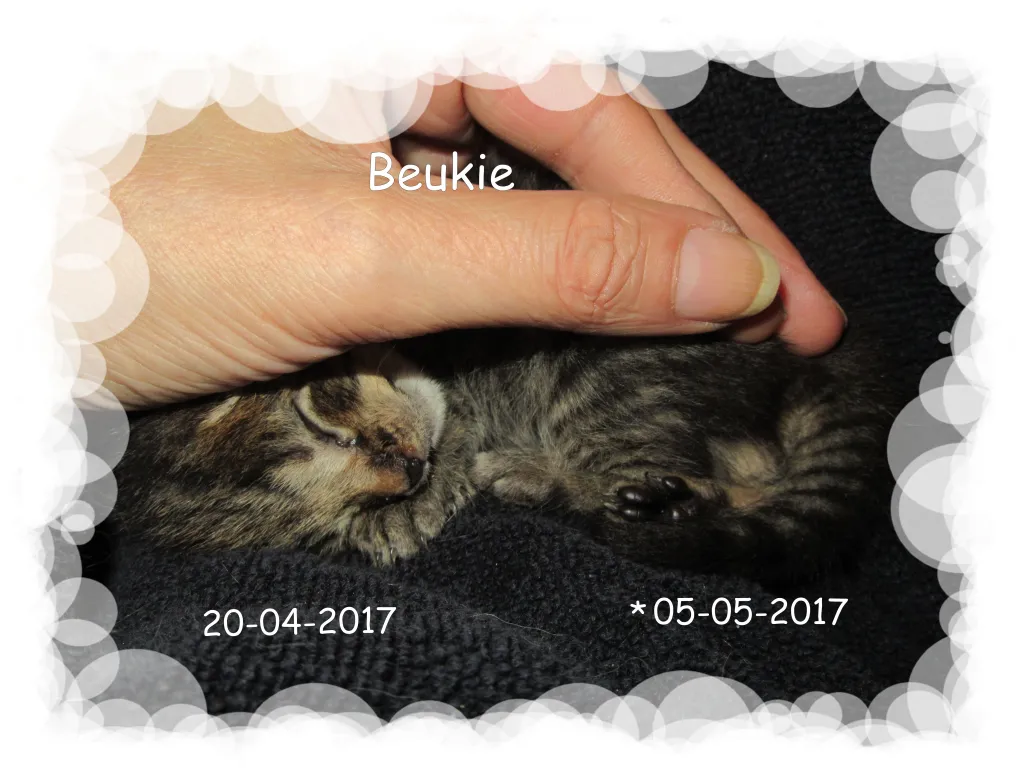 Mama Gizmo gaf geen melk, dus jij en je zusje Garbi kregen sondevoeding en daarna de fles. Tot ons grote verdriet moesten we een week later Garbi ook laten gaan, jij bleek de sterkste te zijn, hoe moeilijk je het ook had, je wist er elke keer weer bovenop te komen.